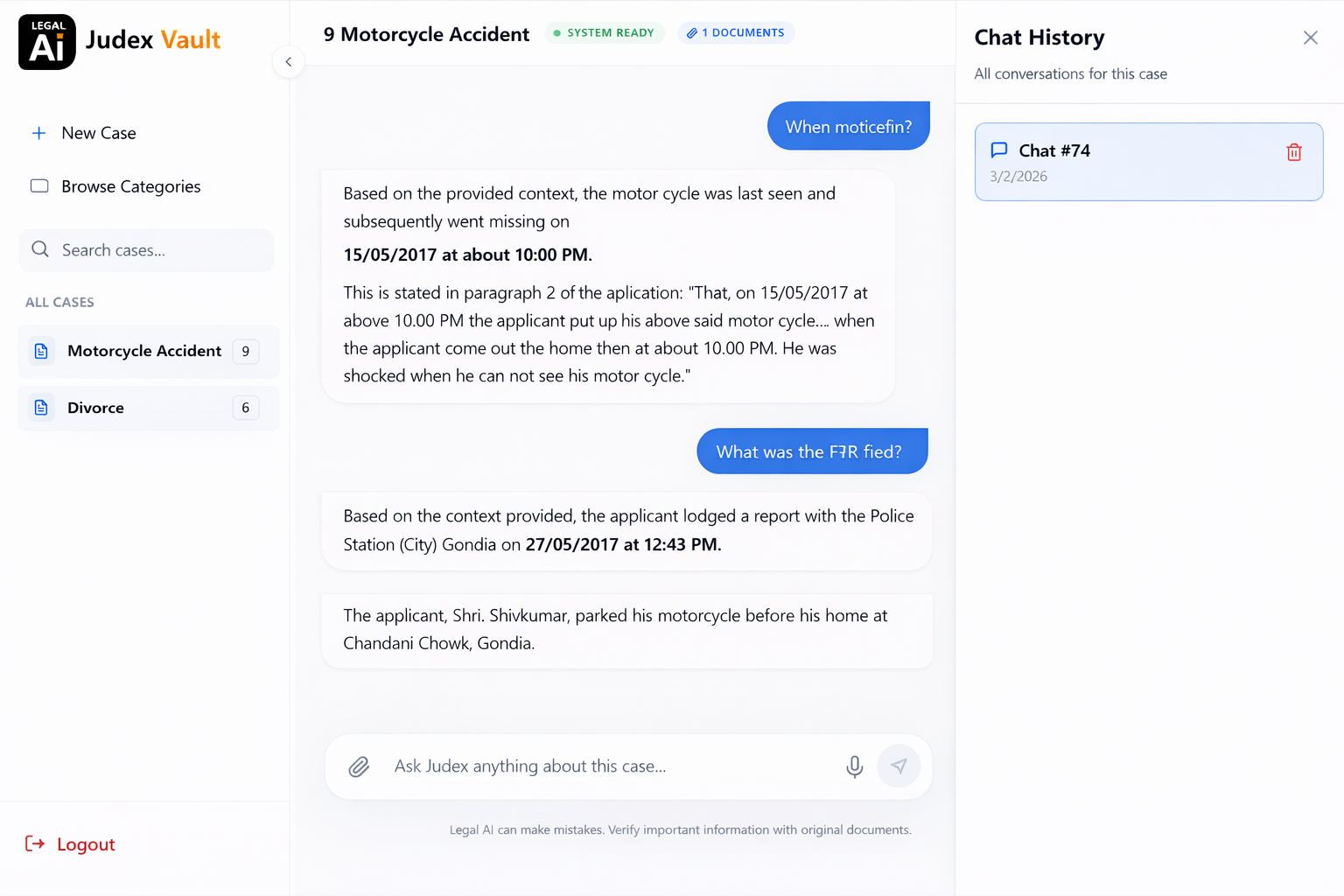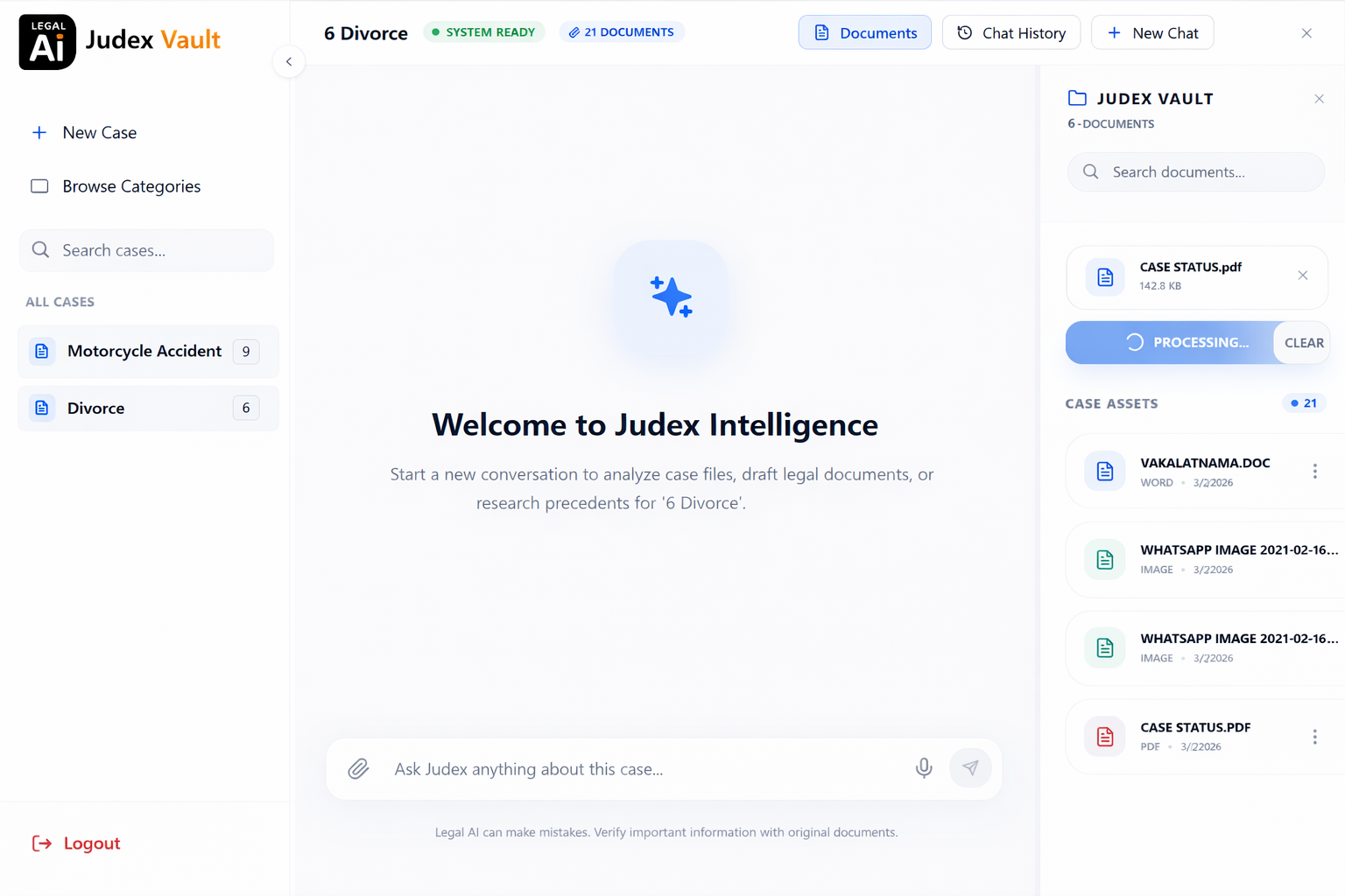Judex Vault is a secure and intelligent legal repository developed by Durwankur AI, designed exclusively for modern legal professionals. It transforms scattered case documents into a structured, searchable, and interactive workspace.
